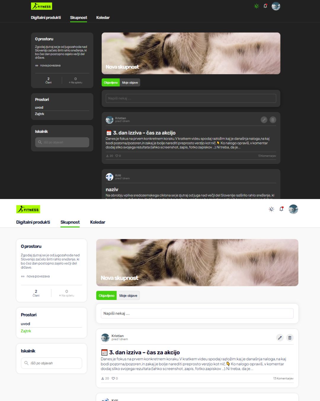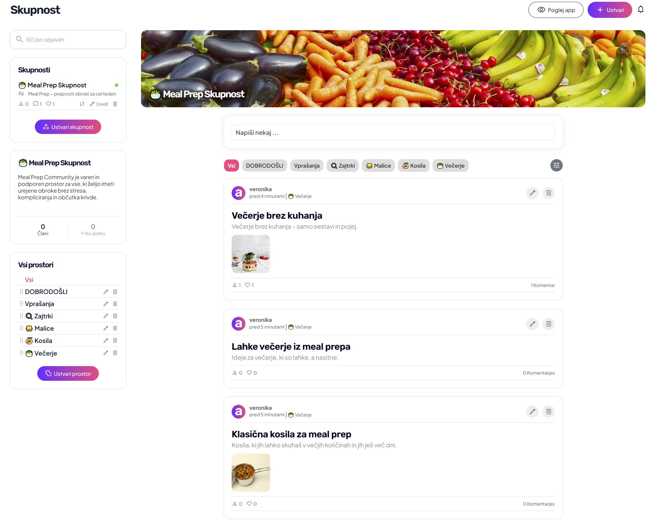 Skupnost je razdeljena na prostore (npr. Dobrodošli, Vprašanja, Napredek, Obvestila).
