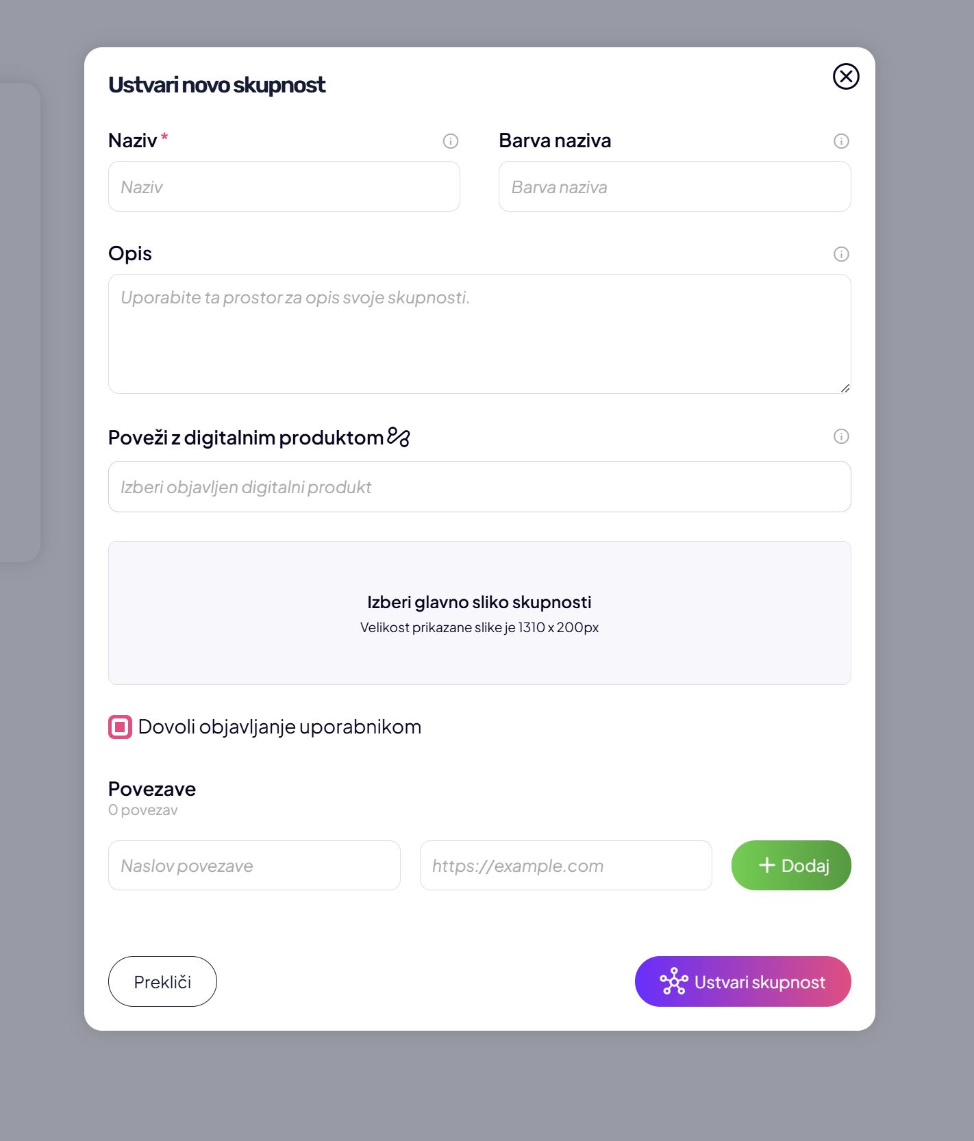 Skupnost lahko povežeš z enim ali več objavljenimi digitalnimi produkti.