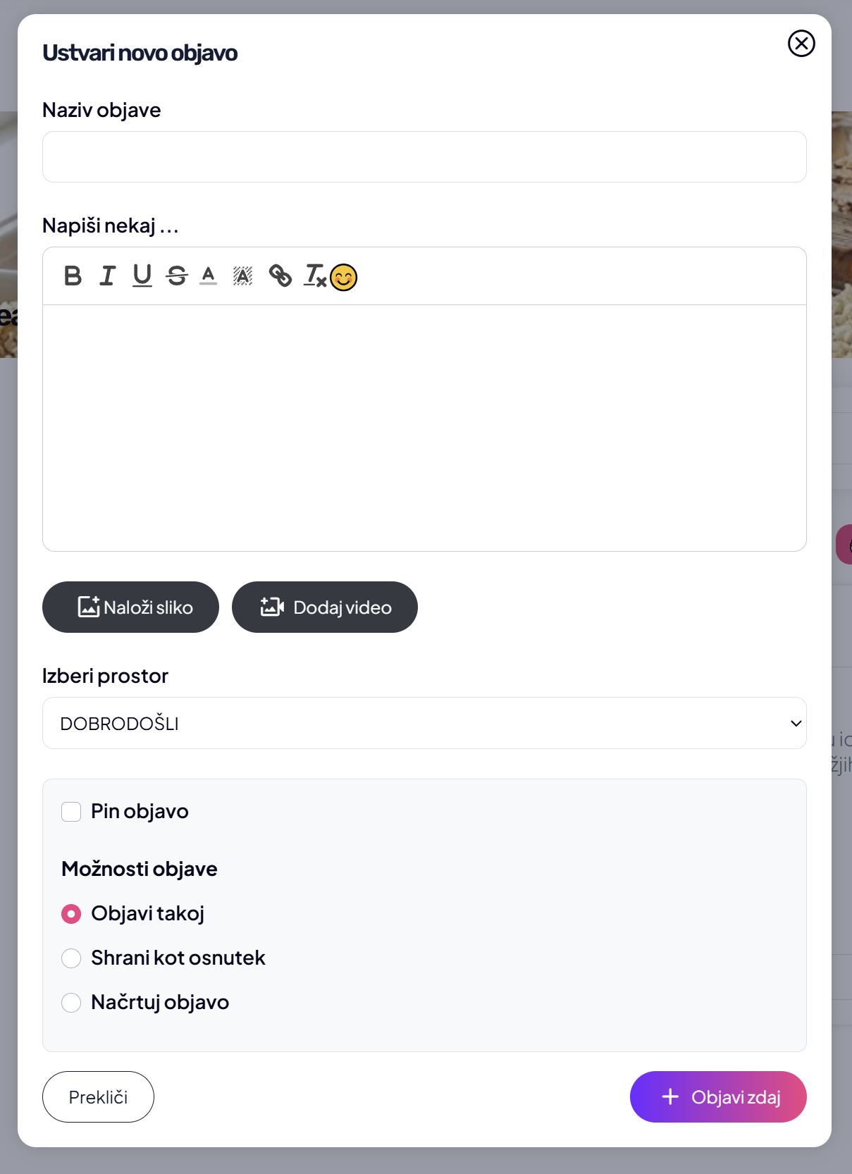 Admin (in po potrebi uporabniki) lahko ustvarjajo objave.