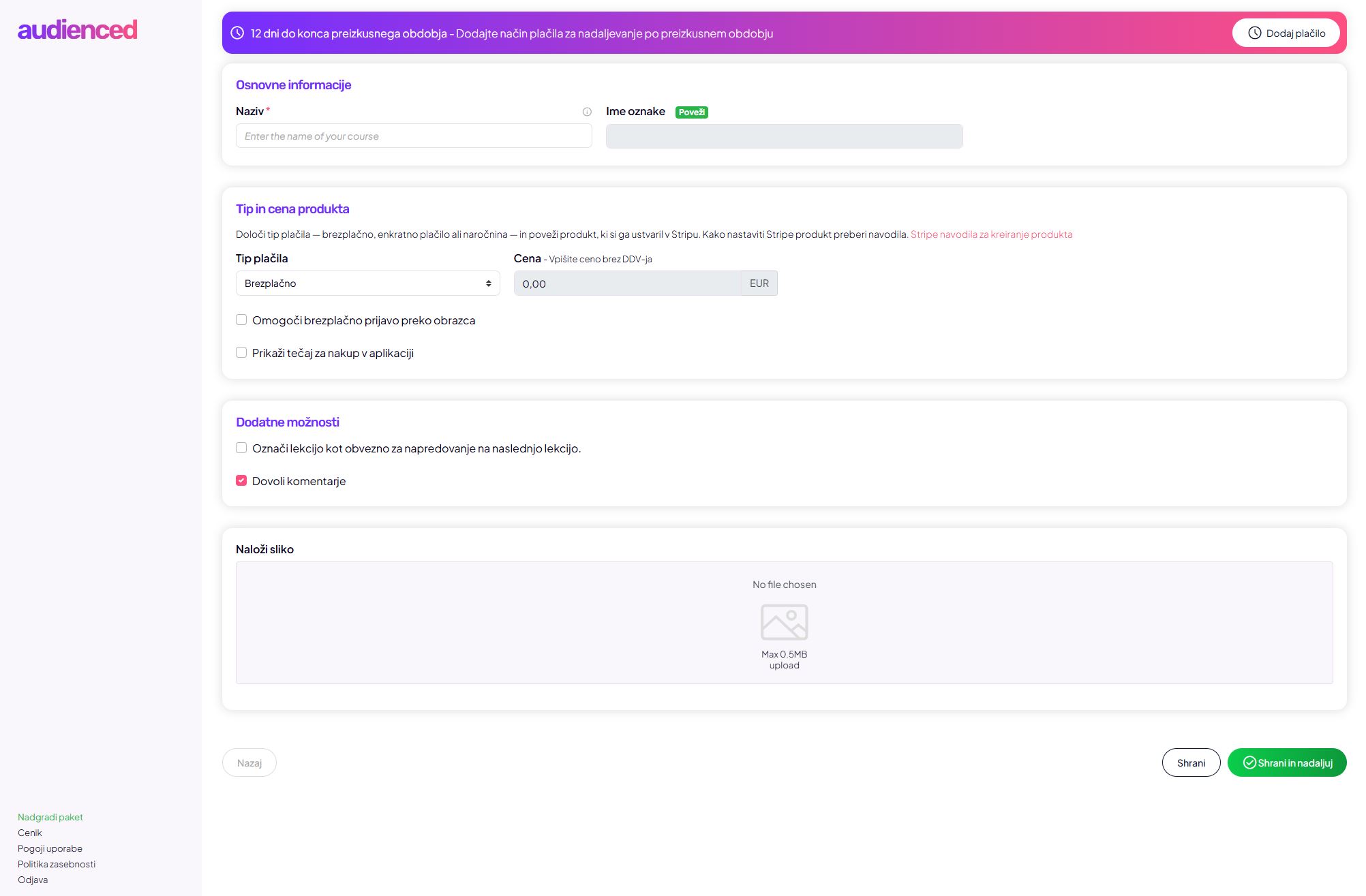 V razdelku Osnovne informacije nastaviš temeljne podatke o tečaju: