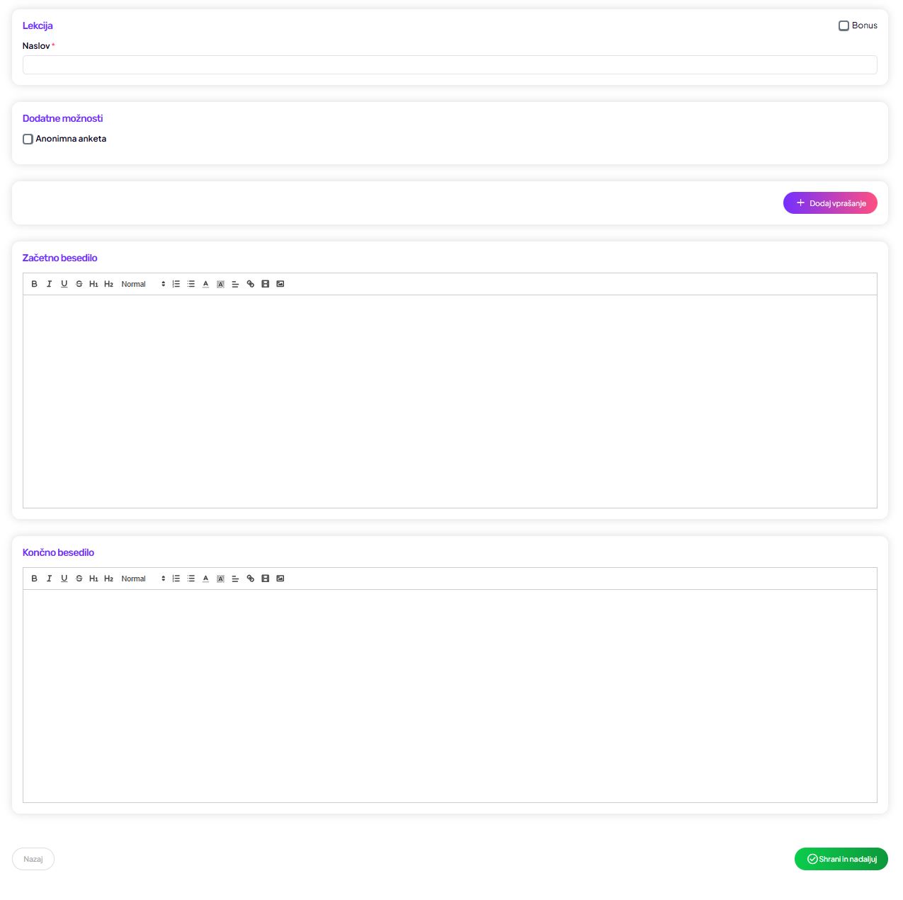 Lekcija z anketo je namenjena zbiranju povratnih informacij, mnenj in ocen uporabnikov. Uporabiš jo lahko ob zaključku tečaja, modula ali izziva, za preverjanje zadovoljstva, razumevanja vsebine ali za pridobivanje idej za prihodnje vsebine.