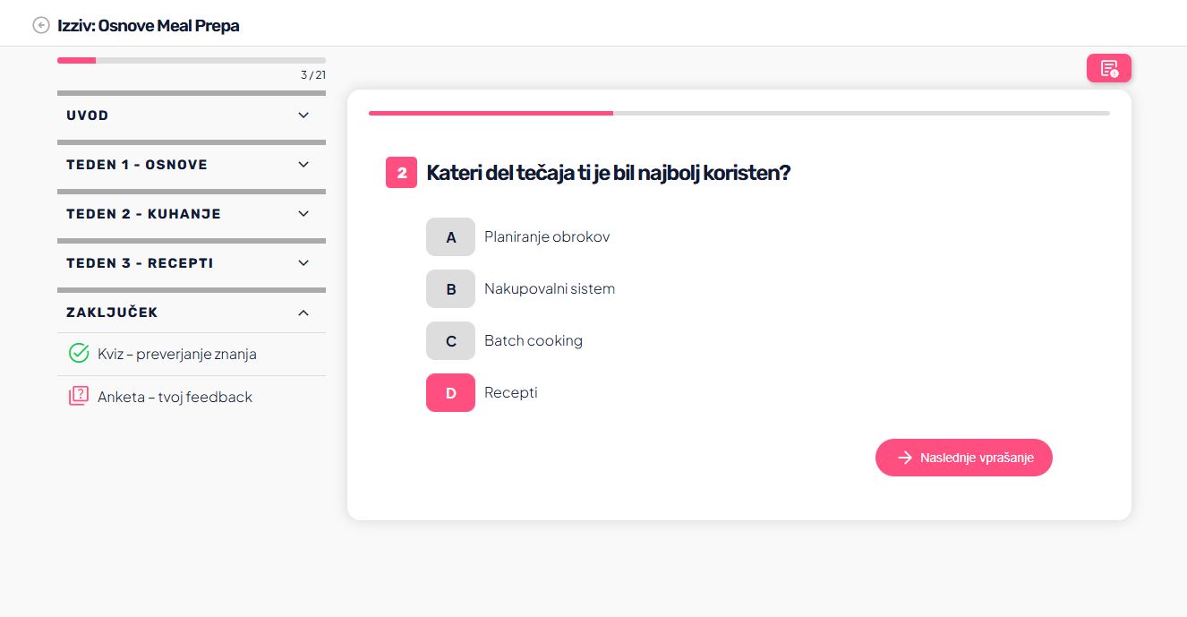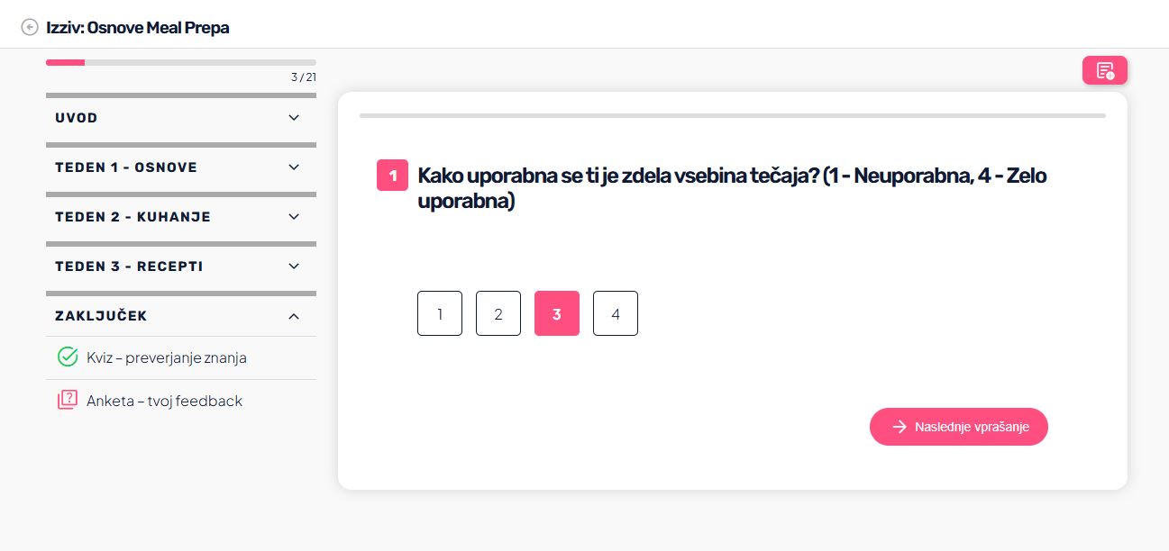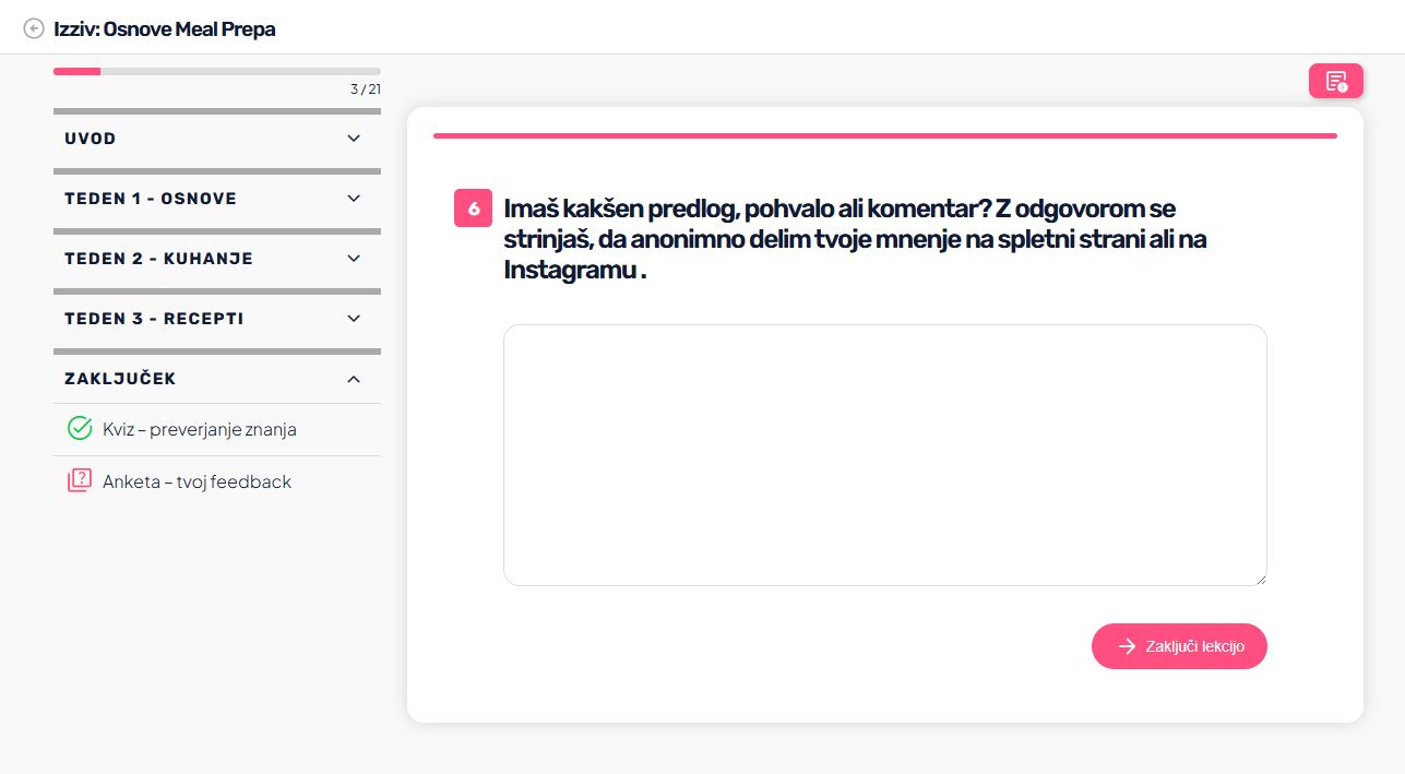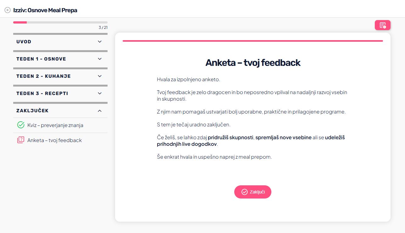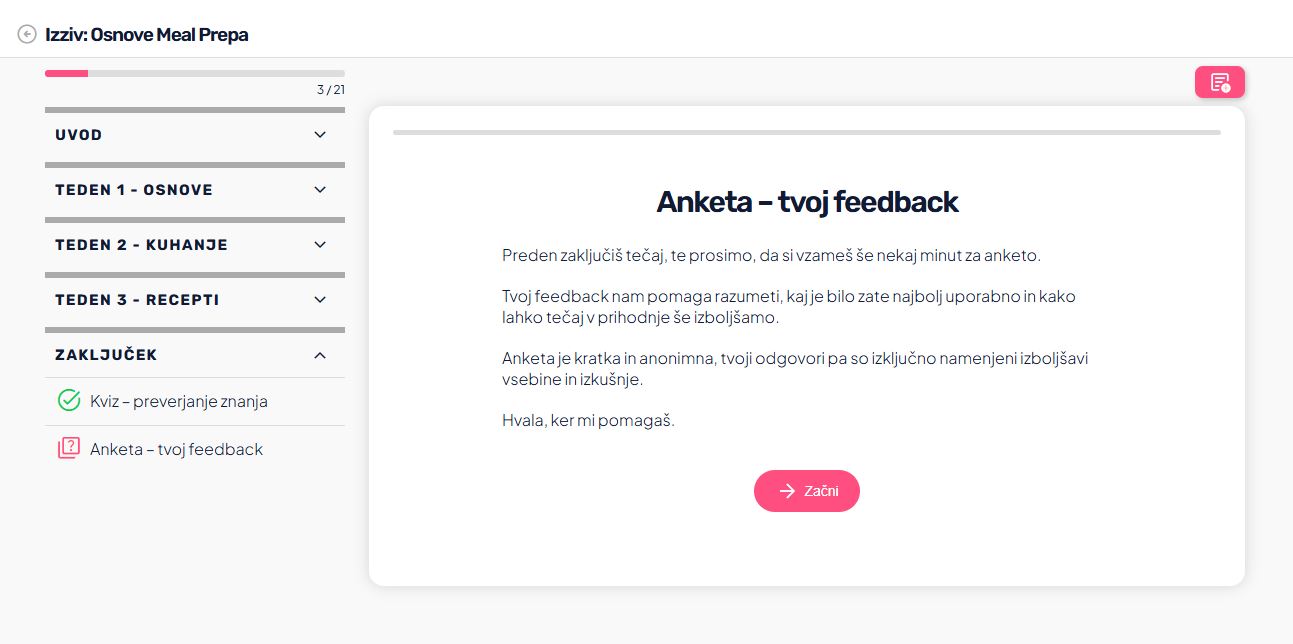 • anketa je pogosto zadnji korak tečaja ali izziva.