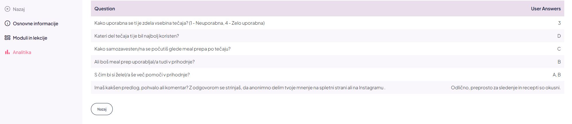 Ko uporabniki izpolnijo anketo, imaš kot admin dostop do rezultatov v razdelku Analitika.