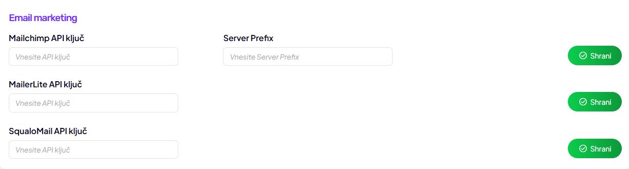 2. V razdelku Email marketing vnesi API ključ izbrane platforme.