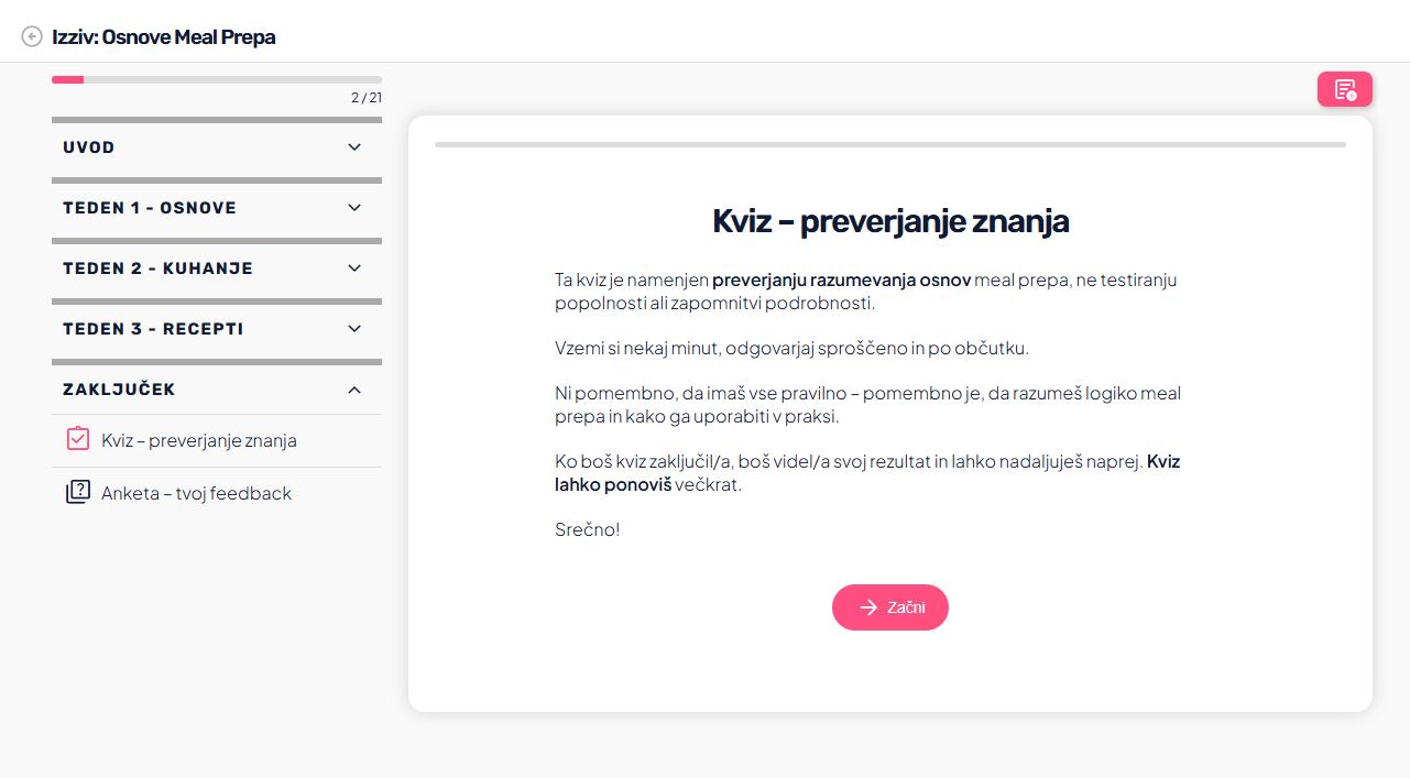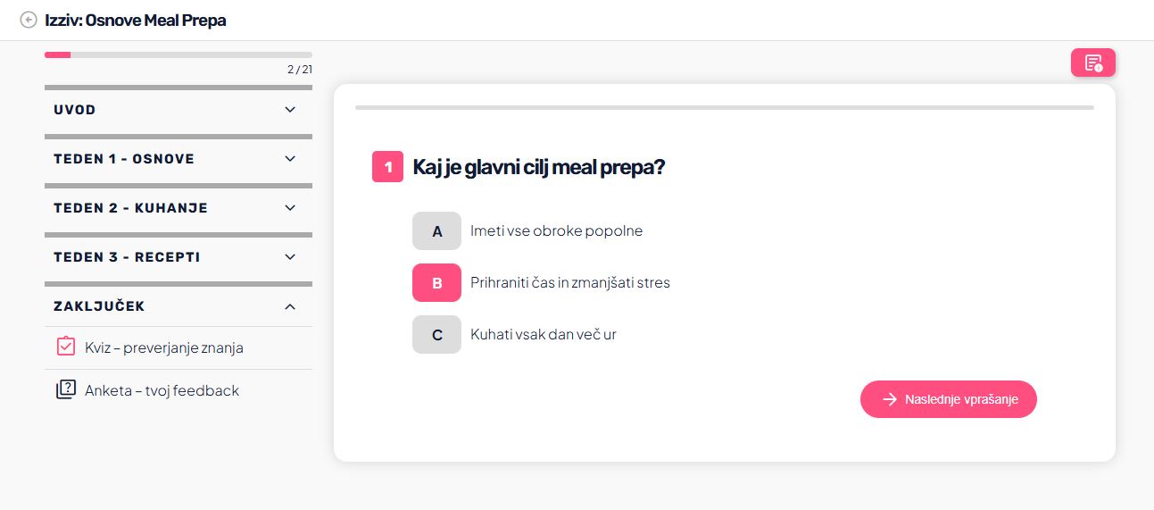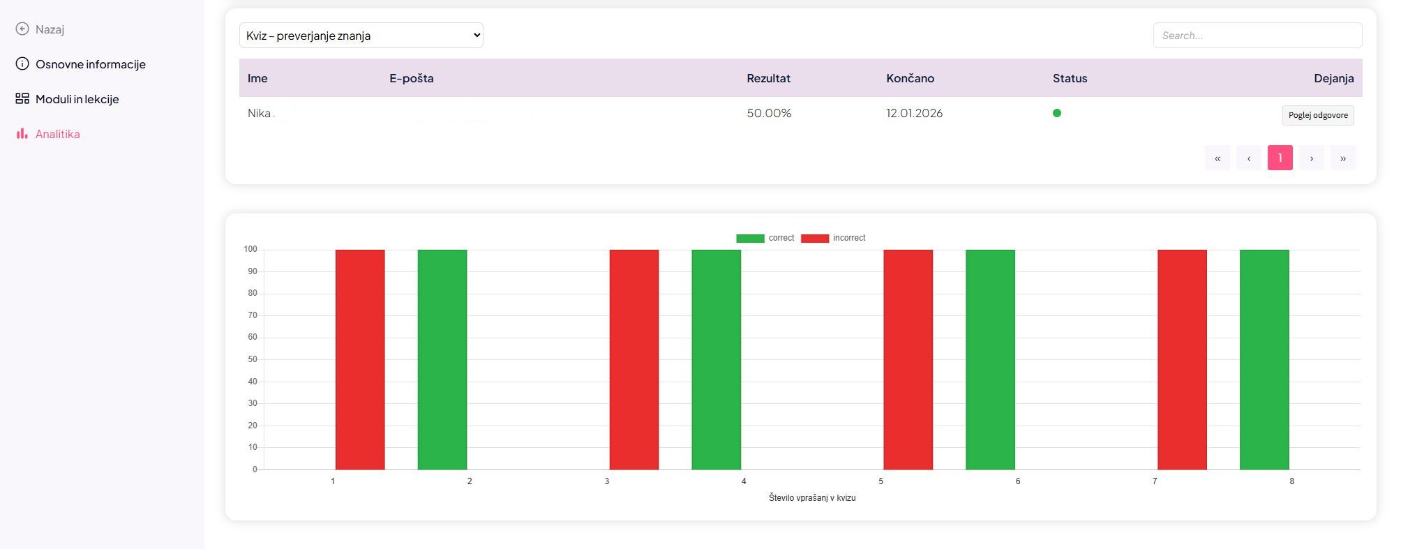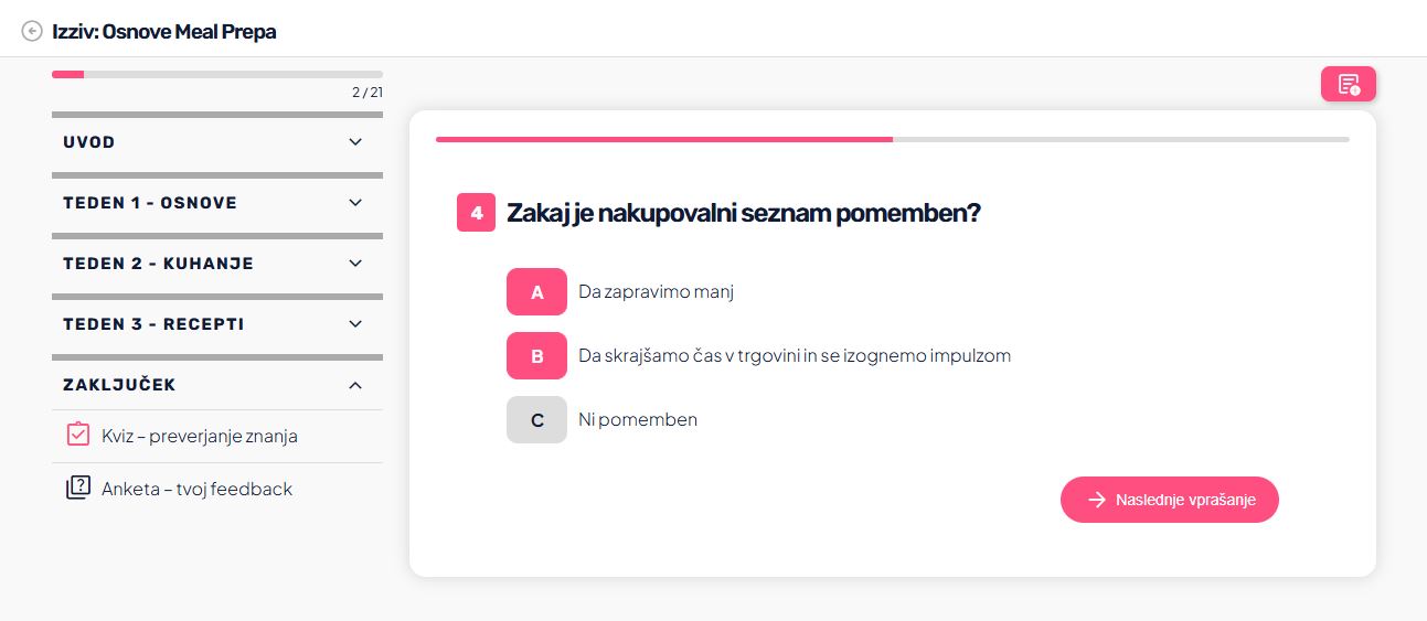 Kviz lahko uporabiš kot zaključek modula, preverjanje znanja po vsebinskem sklopu ali kot pogoj za nadaljevanje na naslednjo lekcijo.