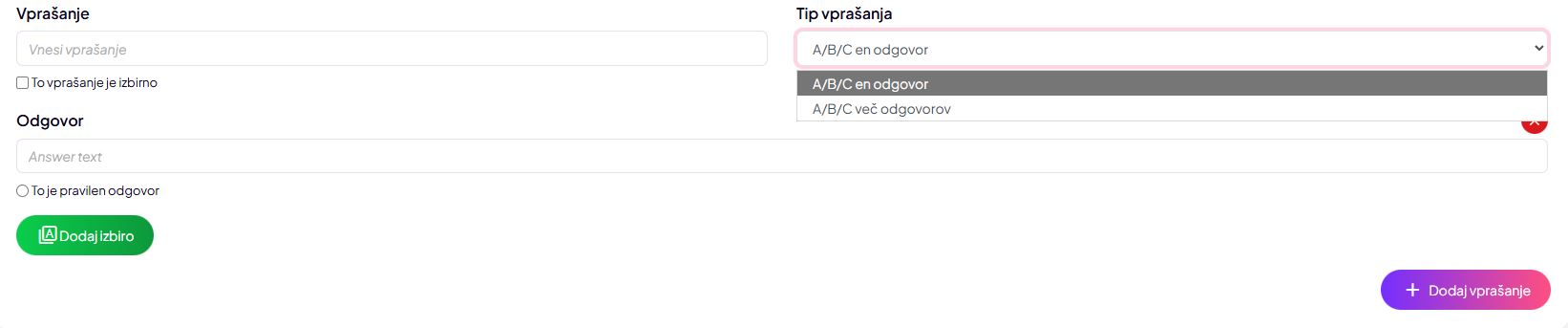 Pri ustvarjanju kviza nastaviš naslednje elemente: