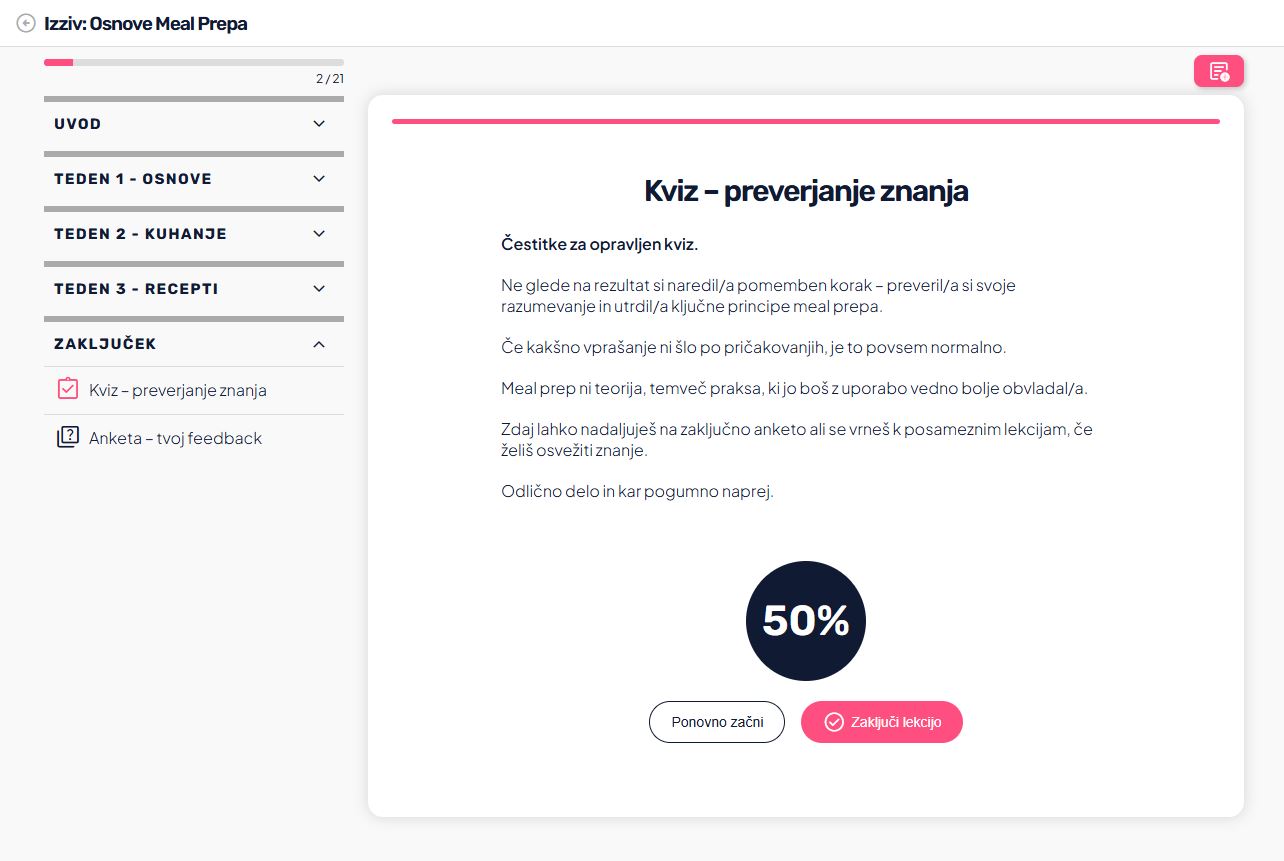 • določitev minimalnega odstotka za uspešno opravljen kviz,