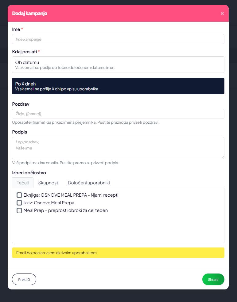 Email kampanje v audienced omogočajo pošiljanje sporočil uporabnikom, ki so vpisani v tvoje tečaje, izzive ali skupnosti – neposredno znotraj platforme, brez uporabe zunanjih email orodij.