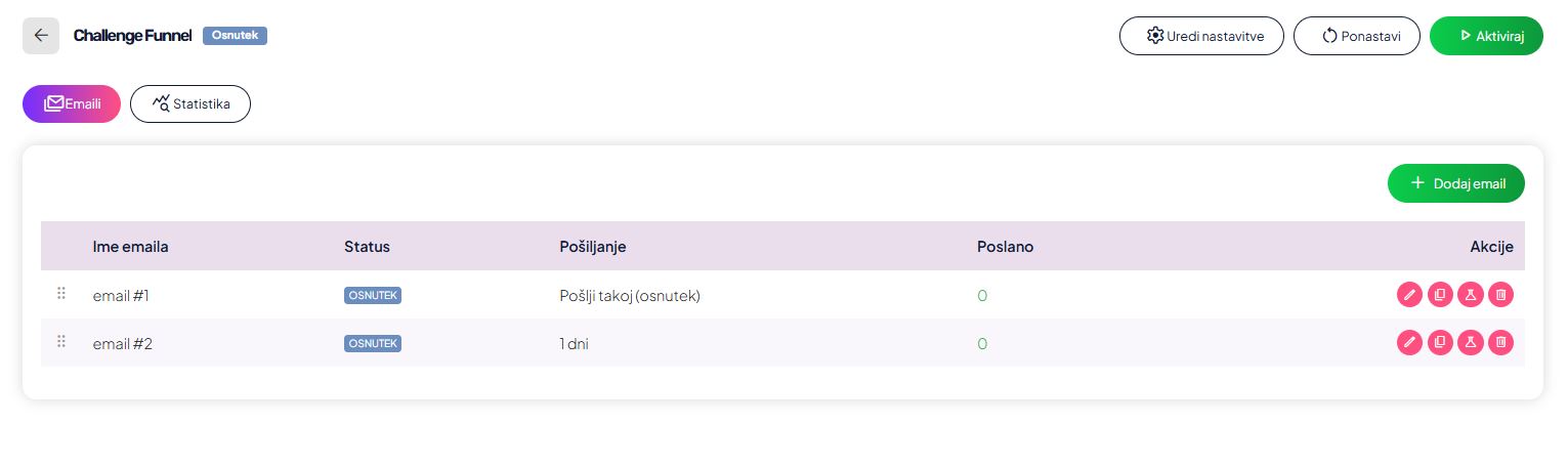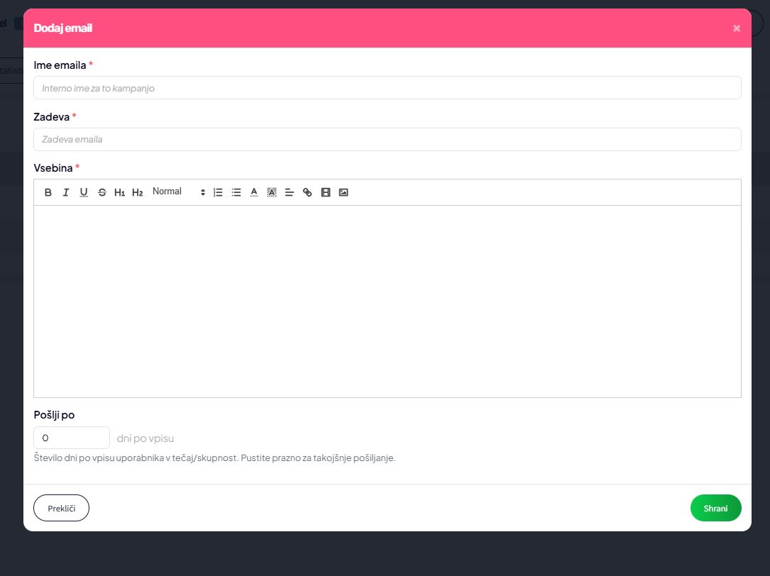 0 ali prazno polje = pošlji takoj1 = pošlji 1 dan po vpisu itd.Email se shrani kot osnutek, dokler kampanje ne aktivirate.