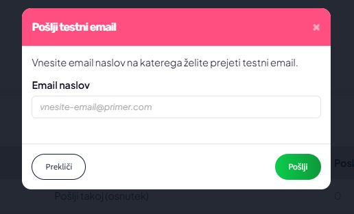 Kliknite Pošlji testni email, vnesite email naslov in preverite: