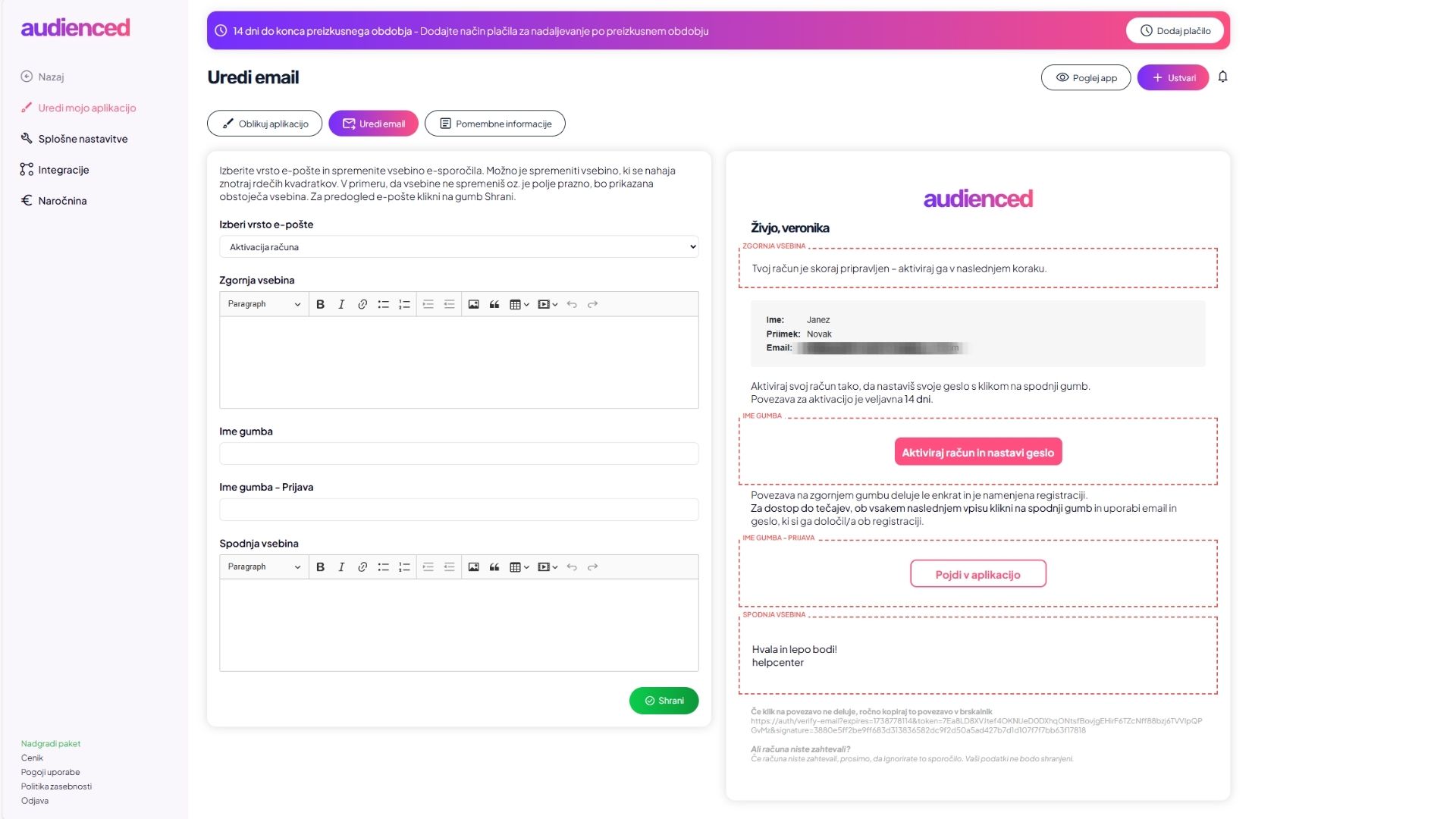 V tem zavihku urejaš vsebino sistemskih e-mailov, ki jih prejmejo tvoji uporabniki.