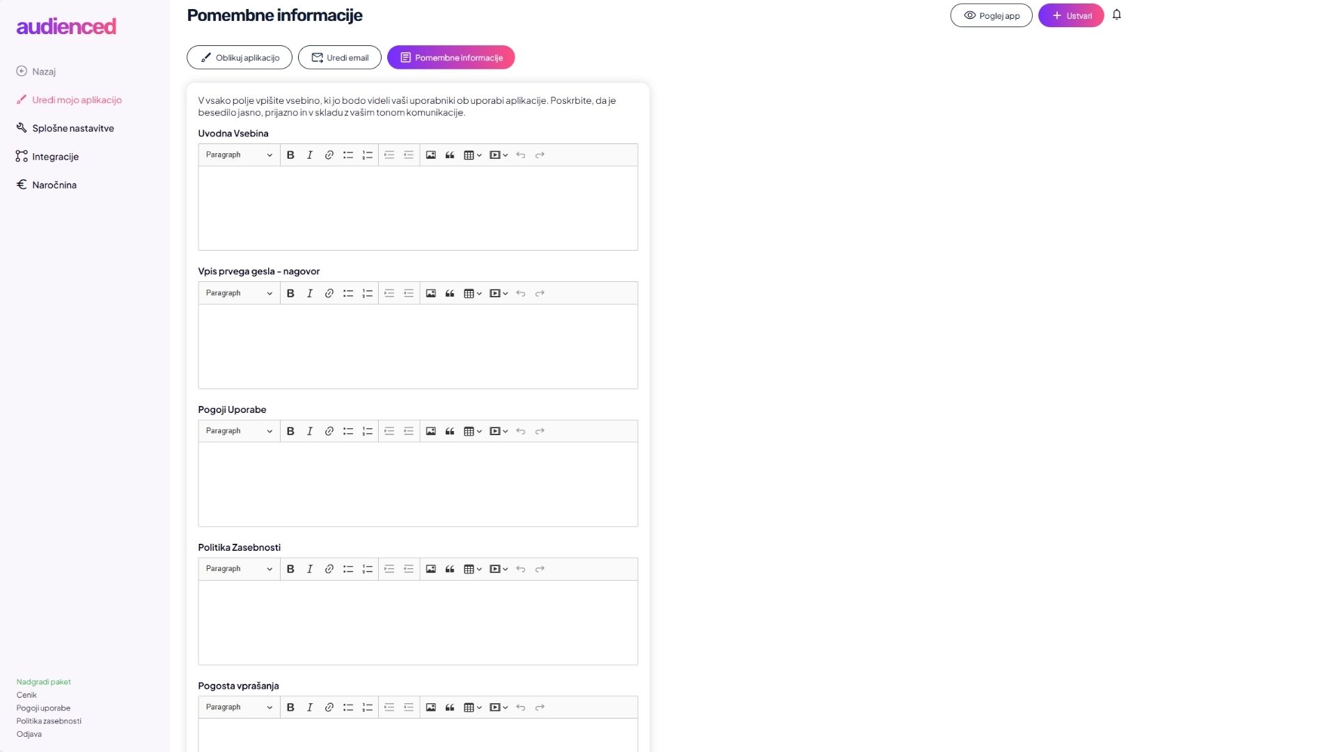 V audiencedu lahko aplikacijo prilagodiš svoji blagovni znamki, tonu komunikacije in načinu dela z uporabniki. Vse nastavitve personalizacije najdeš v razdelku Uredi mojo aplikacijo.