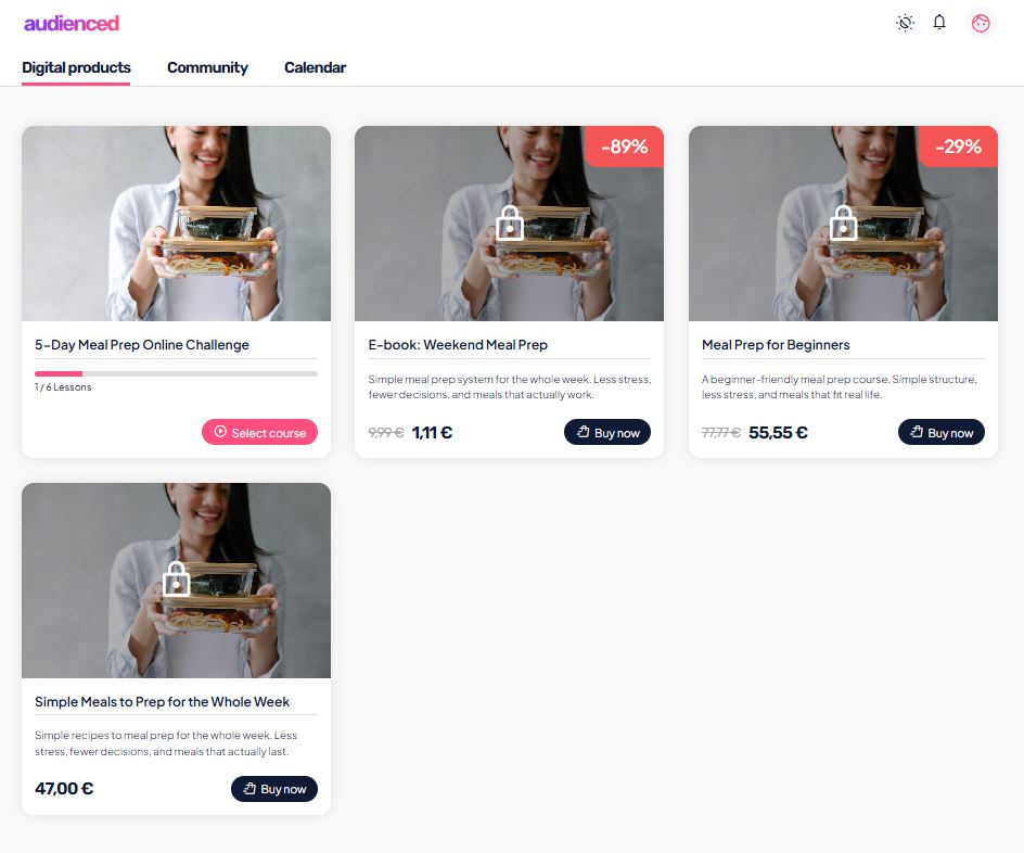 audienced je all-in-one platforma za digitalne produkte in skupnosti, zasnovana tako, da imajo ustvarjalci in njihovi uporabniki eno centralno, pregledno in profesionalno izkušnjo.